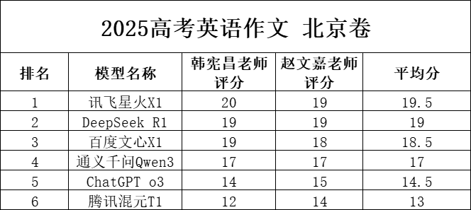 经过严格评审,讯飞星火X1在内容、语言和结构等方面均展现出了出色的水平。两位资深英语教师,北京市十一学校一分校的韩宪昌老师和深圳中学的赵文嘉老师,对讯飞星火X1的作文给予了高度评价。韩老师给出了内容8分、语言8分、结构4分的优异成绩,总分高达20分;赵老师则给出了19分的高分。讯飞星火X1的平均得分在所有参赛模型中位居第一。